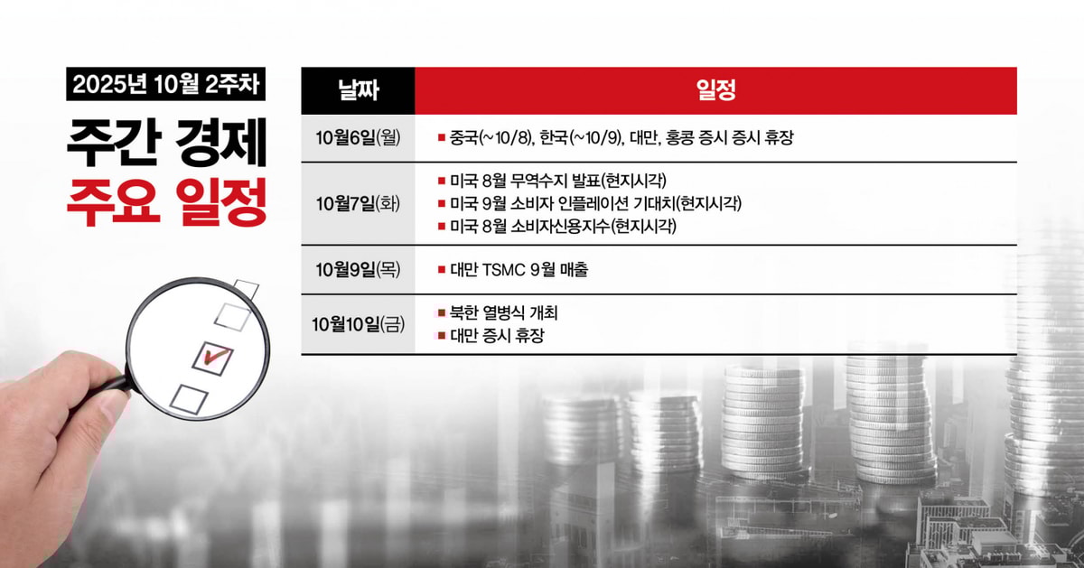 10월 둘째 주는 한국과 중화권 주요 국가들의 연휴로 증시 휴장이 이어지는 가운데 미국의 주요 경제지표 발표가 있을 예정이다. 북한의 대규모 열병식 개최도 주목해야할 이벤트 중 하나다.