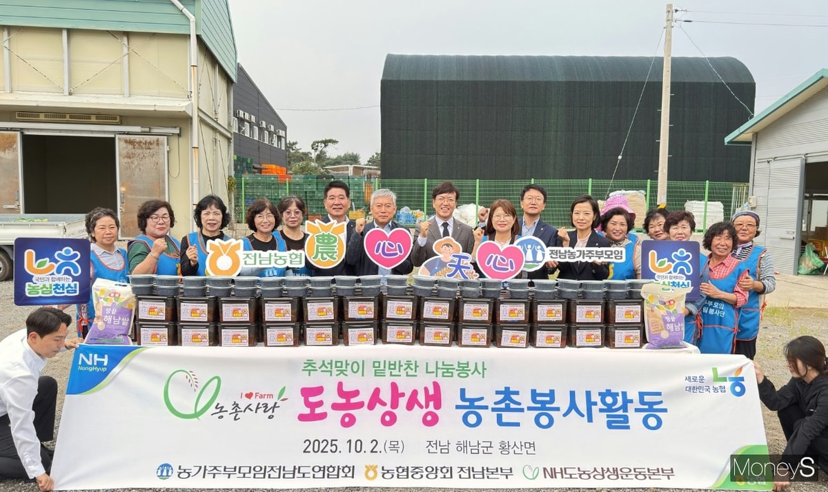 농협전남본부는 2일 해남에서 추석 명절을 앞두고 농가주부모임전남도연합회와 직접 만든 밑반찬 꾸러미 200박스를 고령농 등 취약계층에게 전달했다고 2일 밝혔다. 농가주부모임의 대표적 사회공헌 활동인 밑반찬 나눔사업'찬饌贊'은 가득찰 찬, 반찬 찬, 도울 찬을 담아 건강과 행복을 가득 채운 밑반찬으로 이웃을 돕는다는 의미가 있으며, 매년 정기적으로 나눔 행사를 실천하고 있다.