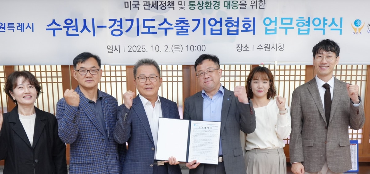 수원특례시가 미국 관세정책으로 어려움을 겪는 중소기업을 지원하기 위해 '피해기업 전담창구'를 운영한다. 수원시는 2일 시청에서 수출지원기관 경기도수출기업협회와 관세 피해 기업 지원 업무협약을 체결했다고 밝혔다. 이날 협약식에는 김현수 수원시 제1부시장, 강성호 경기수출기업협회 회장 등이 참석했다.