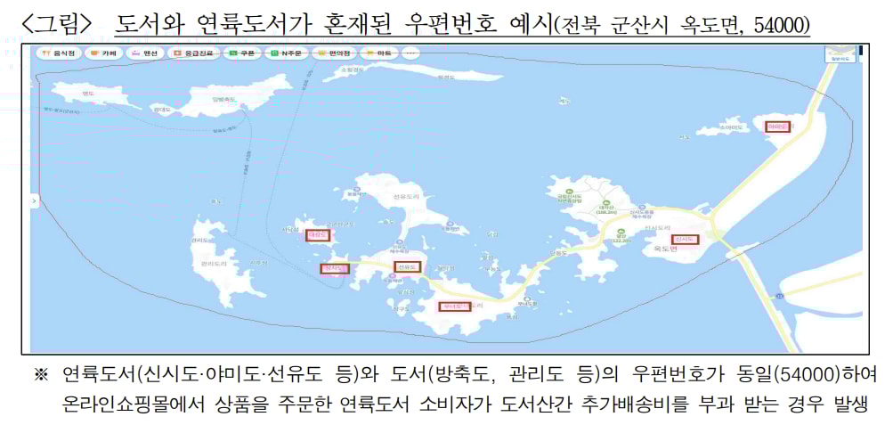 13개 온라인쇼핑몰 사업자는 인근 도서(섬)와 우편번호가 동일한 일부 연륙도서에 추가 배송비가 자동으로 부과되도록 시스템을 운영했다. 실제로는 입점업체 등이 택배사로부터 추가배송비를 부과받지 않았음에도 소비자에게 추가 배송비가 부과됐던 셈이다.