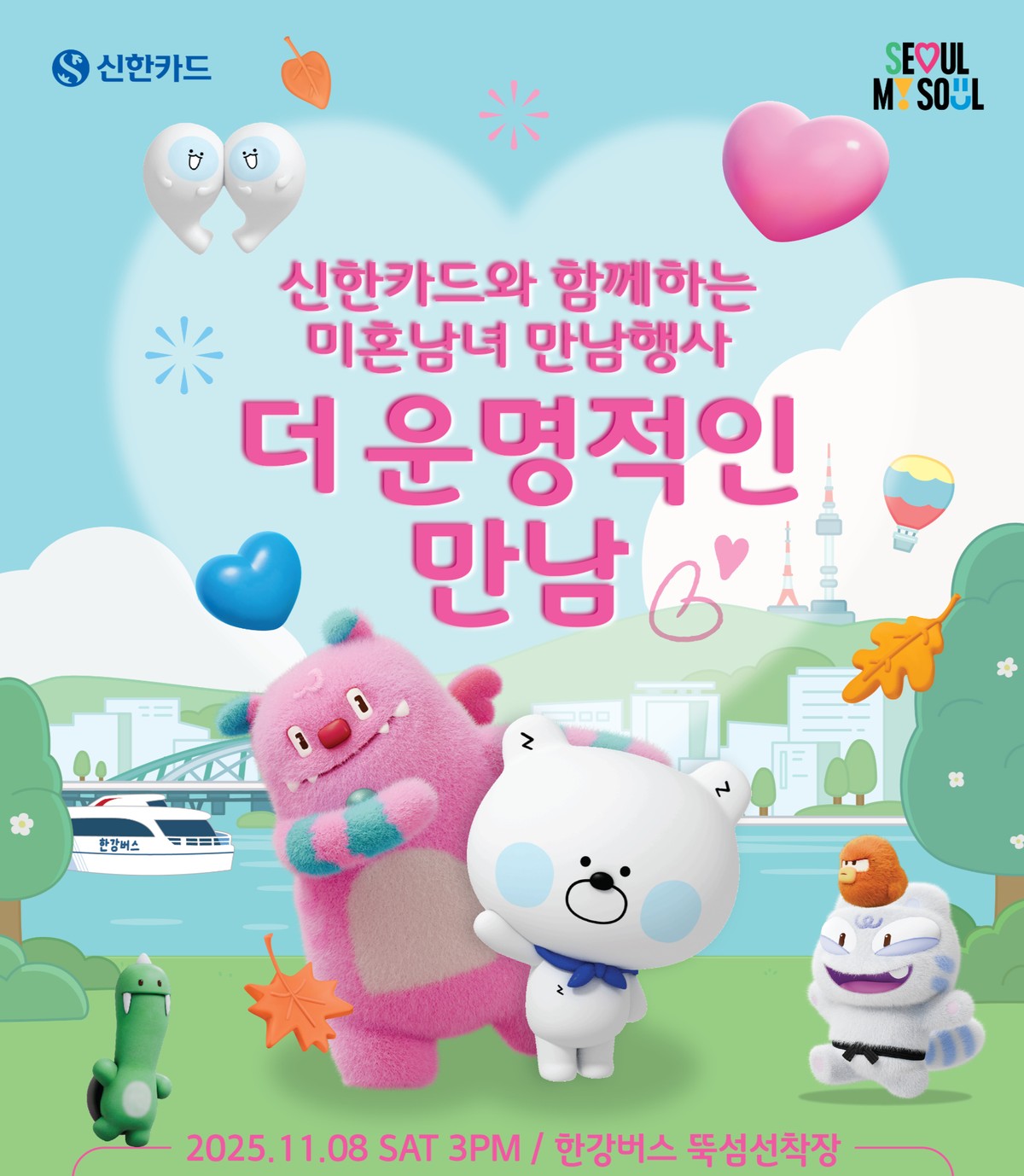신한카드가 서울시와 협력해 미혼남녀 교류 프로그램 '더 운명적인 만남'을 전액 후원한다고 10일 밝혔다. 행사는 오는 11월 8일 한강버스 뚝섬선착장에서 열린다.