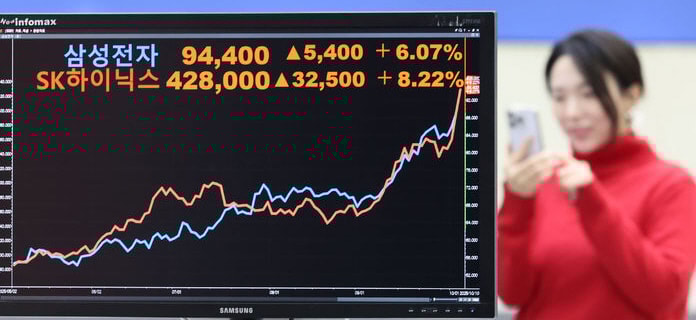 삼성전자는 이날 한때 9만4500원, SK하이닉스는 42만8000원까지 고점을 찍었다. 오픈AI(인공지능) 스타게이트 호재 전이었던 지난달 26일에 비하면 종가 기준 상승 폭이 삼성전자 13.3%, SK하이닉스는 27.1%에 달했다.