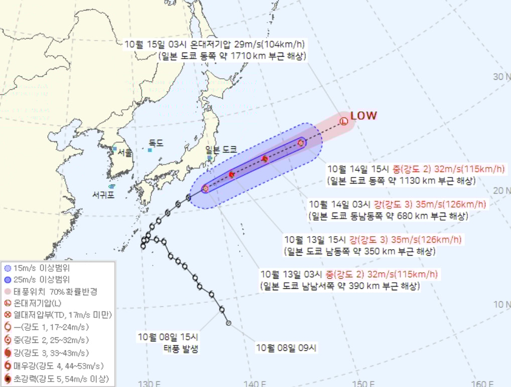 이후 일본 도쿄 해상을 따라 북상하다 오는 15일 오전 3시쯤 일본 도쿄 동쪽 약 1130㎞ 부근 해상에서 온대저기압으로 변질될 것으로 예상돼 우리나라는 직접적인 영향을 주진않을 전망이다. 그러나 간접영향으로 동해와 남해에 거센 너울이 밀려들 것으로 보여 주의가 요구된다.