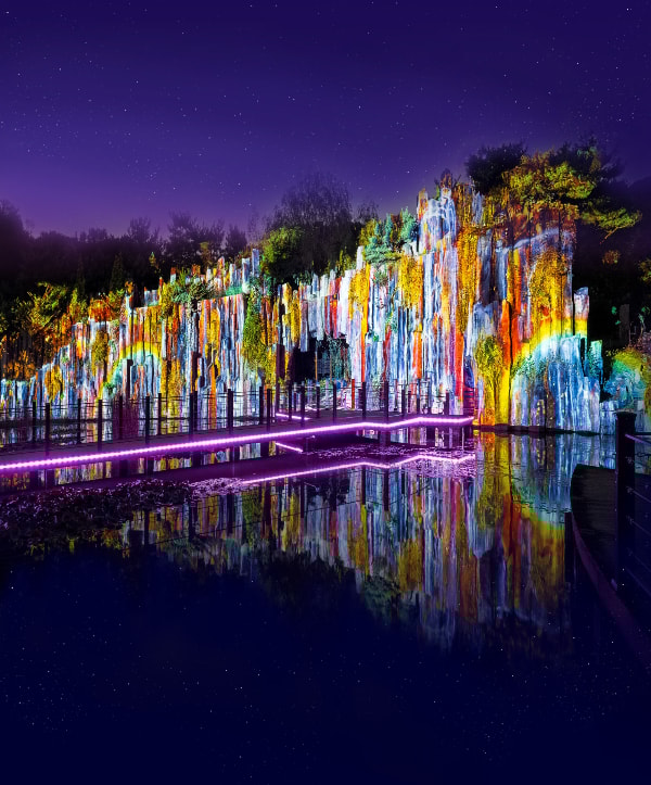 '루미나래 도화몽'은 부천자연생태공원 내에 조성된 감성형 미디어아트 야간경관 콘텐츠로, 복사꽃잎이 기억하는 날씨를 주제로 빛과 음악, 자연이 어우러진 몰입형 판타지 공간을 연출한다.