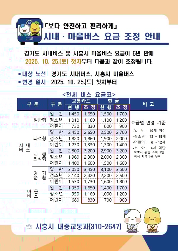 시흥시는 오는 25일 첫차부터 경기도 시내버스와 시흥시 마을버스 요금을 인상한다고 밝혔다.