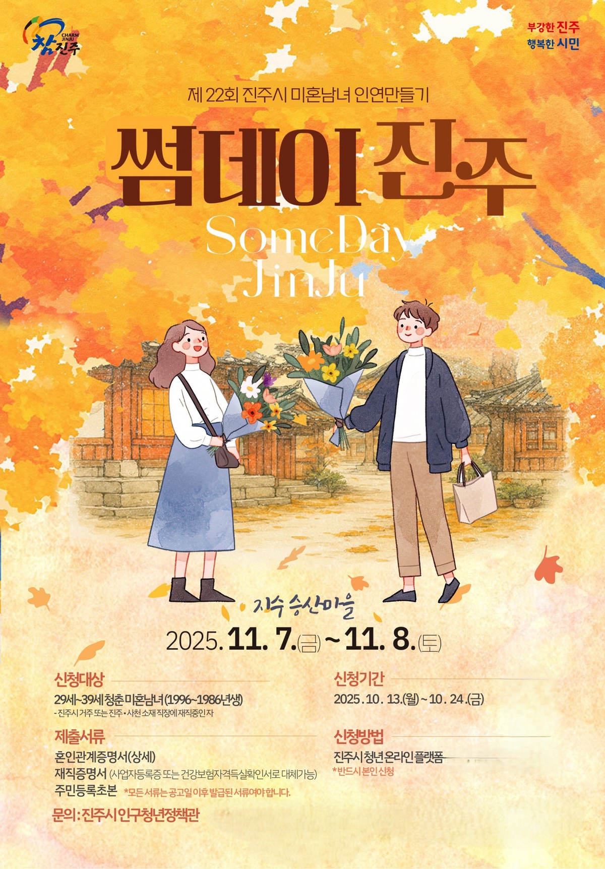 진주시는 11월7일부터 8일까지 지수면 승산마을 일원에서 열리는 청춘 남녀 만남 프로그램 '썸데이 진주'의 참가자를 13일부터 24일까지 모집한다고 13일 밝혔다.