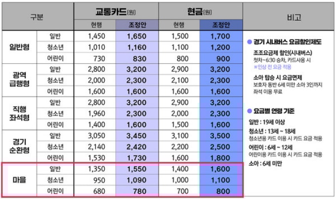 그 결과 교통카드 기준 △일반 시내버스 요금은 성인 1450원→1650원, 청소년 1010원→1160원, 어린이 730원→830원 △직행좌석형과 광역급행형(M) 버스는 성인 2800원→3200원, 청소년 1960원→2300원, 어린이 1400원→1600원 △경기순환형 버스는 성인 3050원→3450원, 청소년 2140원→2420원, 어린이 1530원→1730원 △마을버스 요금은 성인 1350원→1550원, 청소년 950원→1090원, 어린이 680원→780원으로 각각 인상된다.