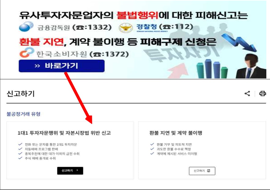 여기에 금감원은 유사투자자문 피해신고로 바로 연결되는 배너를 금감원, 한국소비자원, 증권사 홈페이지(MTS)에 게시했다. 배너의 '바로가기' 버튼 한 번으로 투자자가 신속히 피해에 대응할 수 있도록 했다.
