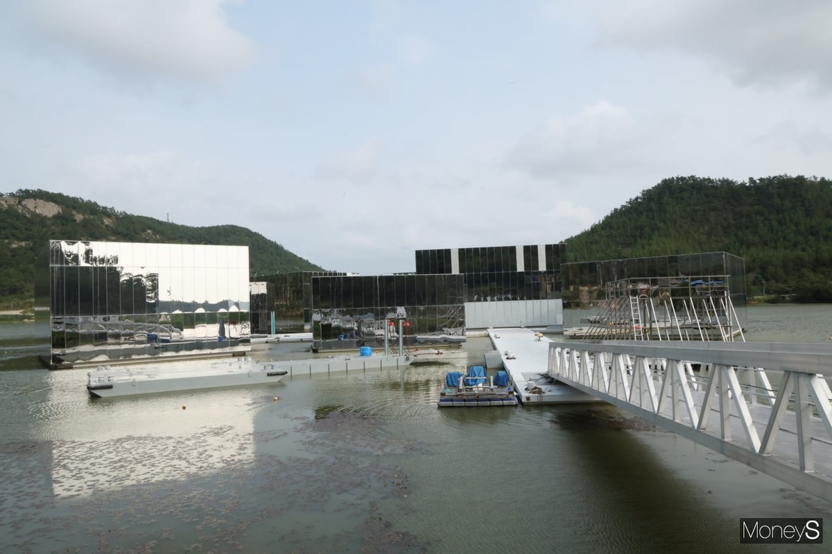 이날도 내년 3월 준공을 목표로 외관 보수와 내장 도장작업이 한창이었다. 1588㎡ 규모로 큐브 형태의 전시실 5개와 수장고·사무실 등 총 7동으로 구성됐다. 물 위 전시실 등을 연결할 도교 60m도 설치한다. 내년 8~9월쯤 개관 후에는 4개 큐브에서 야나기의 대형 설치미술 5점이 상설 전시되며 1개 큐브에서는 기획전시가 열리게 된다.