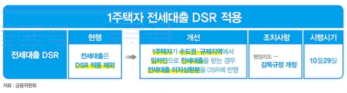 또 1주택자(소유주택의 지역은 무관)가 수도권·규제지역에서 임차인으로서 전세대출을 받는 경우에는 전세대출의 이자상환분을 차주의 DSR에 반영한다. 이번 조치가 무주택 서민 등에 미치는 영향을 감안해 1주택자의 수도권 ․ 규제지역 전세대출에 우선 적용하되, 향후 전세대출 DSR 시행 경과 등을 보아가며 단계적인 확대 방안을 검토해 나갈 계획이다.