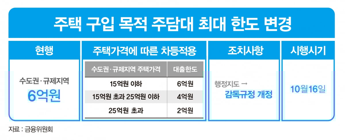 주담대 한도는 아파트 가격에 따라 차등 조정한다. 수도권·규제 지역의 15억원 초과 25억원 이하 주택은 4억원의 주택담보대출 한도가 적용된다. 25억원 초과 주택은 2억원으로 대출한도를 차등 적용한다. 15억원 이하 주택의 주담대 한도는 현행과 동일한 6억원으로 유지된다.