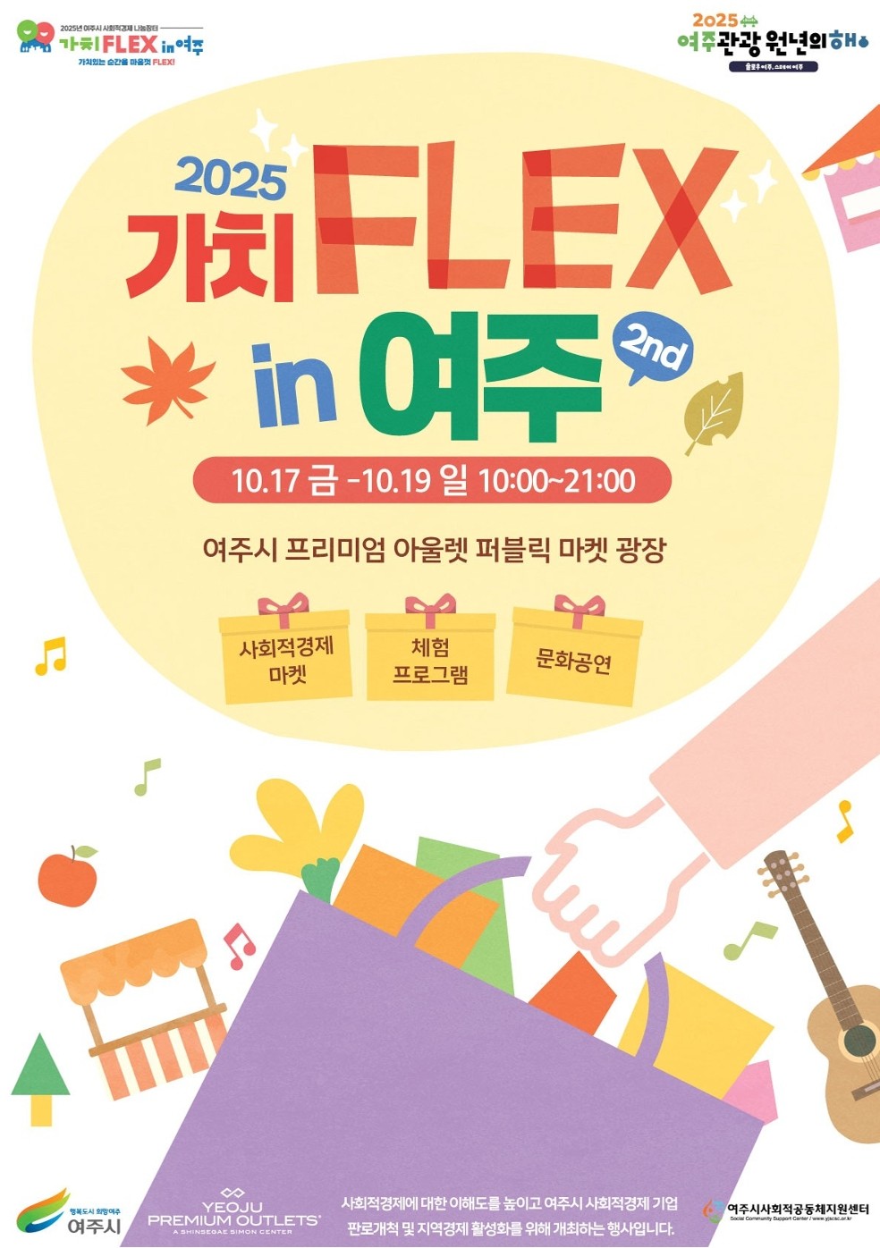 여주시가 오는 17일부터 19일까지 3일간 여주 프리미엄아울렛 퍼블릭마켓광장 일원에서 2025년 여주시 사회적경제 단기기획전 '가치FLEX in 여주, 2nd' 를 개최한다고 15일 밝혔다.