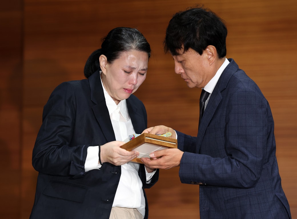 이날 기자회견 전 오요안나를 추모하며 묵념의 시간을 가졌다. 안 사장과 고인 어머니 장연미씨는 합의서에 서명했다. 장씨는 고인의 명예 사원증을 받고 눈물을 쏟았다. 안 사장은 장씨와 포옹하며 위로를 건넸다.