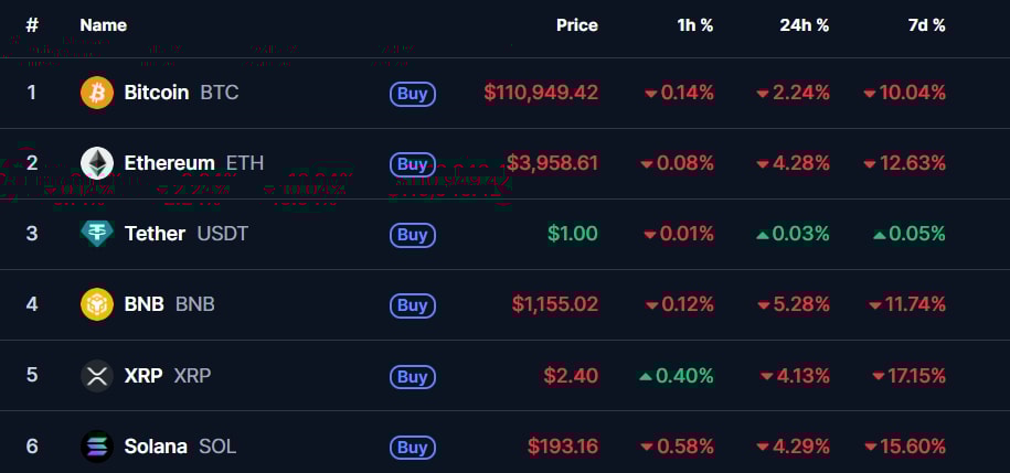 시총 4위 바이낸스 코인도 5.24% 급락한 1157달러, 시총 5위 리플은 3.28% 하락한 2.40달러, 시총 6위 솔라나는 2.88% 하락한 194달러에 거래되고 있다.
