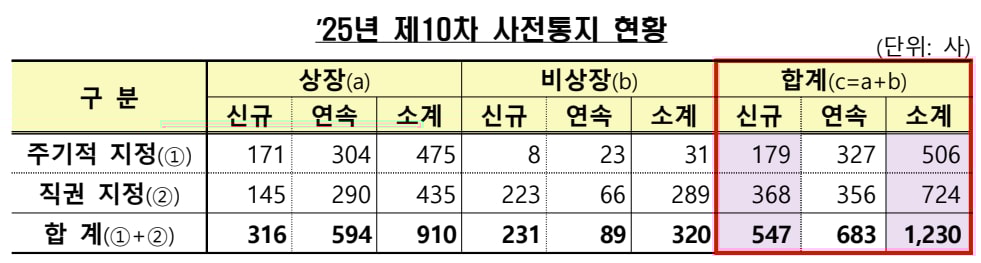 직권 지정의 경우 신규 지정사유가 발생한 368사가 새로 지정됐다. 지정사유별로는 상장예정 202사(54.9%)가 가장 많았고, 3년 연속 영업손실 등 재무기준 미달 78사(21.2%), 관리종목 31사 순이었다.