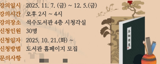안양대학교 지역인문학센터가 협업해 진행하는 이번 인문 강좌는 시민들이 한시의 매력적인 세계를 깊이 탐구하고, 한시를 읽는 즐거움을 제공할 예정이다. 서울대학교 중국어문화연구소 책임연구원이자 한시 칼럼니스트 강성위가 강의를 진행한다. 오는 21일부터 안양시도서관 홈페이지에서 강좌를 신청할 수 있다.