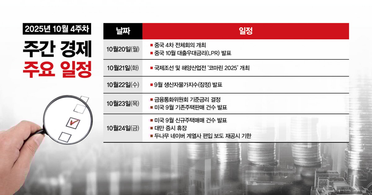 10월 넷째 주는 중국의 4차 전체회의와 한국은행 금융통화위원회 등이 예정돼 있다. 중국의 중장기 경제 전략과 시진핑 주석의 4연임 행보, 한국의 기준금리 결정이 동시에 발표되며 글로벌 경기 방향성을 가늠할 분수령이 될 전망이다.