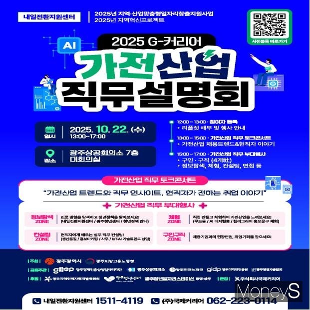 광주경제진흥상생일자리재단은 오는 22일 낮 1시 광주상공회의소 7층 대회의실에서 '2025 G-커리어 가전산업 직무설명회'를 개최한다고 17일 밝혔다.