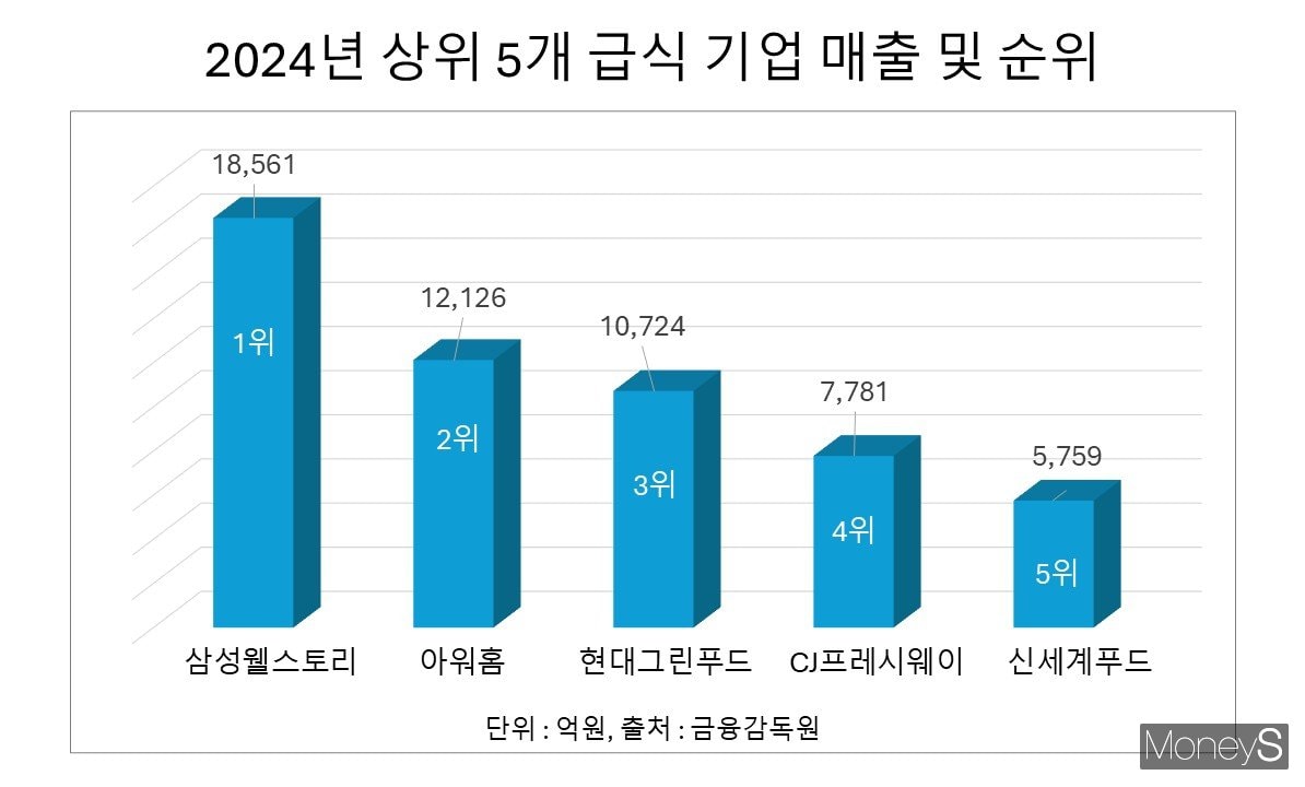 20일 금융감독원 전자공시시스템과 급식업계에 따르면 지난해 기준 국내 단체급식 시장은 삼성웰스토리(매출 약 1조8561억원)가 1위를 지키고 있다. 아워홈(1조2126억원), 현대그린푸드(1조724억원), CJ프레시웨이(7781억원), 신세계푸드(외식 포함 5759억원)가 그 뒤를 잇고 있다. 아워홈이 신세계푸드 급식사업부를 품에 안게 되면 단순 합산 시 매출 규모가 약 1조7885억원으로 삼성웰스토리와 양강 구도를 형성하게 된다. 한화그룹의 지원이 뒷받침된다면 언제든 1위가 뒤바뀔 수 있는 상황이 되는 셈이다. 이는 아워홈의 시장 지배력을 공고히 하고 규모의 경제를 통해 원가 경쟁력을 확보하는 핵심 동력이 될 것으로 보인다.