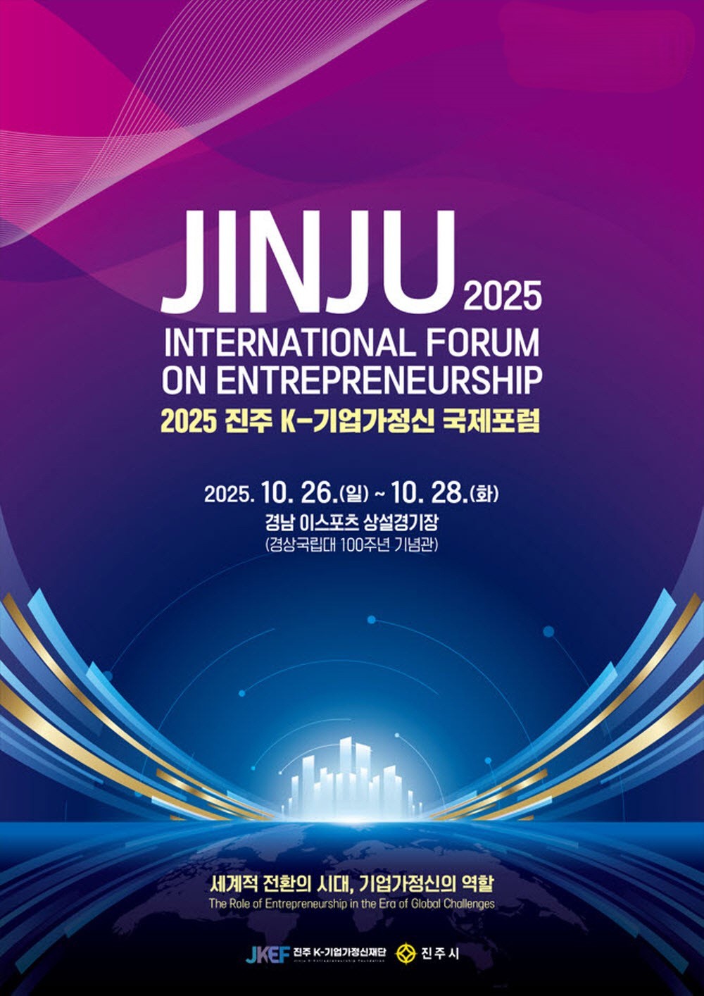 진주시와 진주 K-기업가정신재단은 오는 26일부터 28일까지 경상국립대학교 100주년기념관(경남 e스포츠경기장) 등 진주시 일원에서 '2025 진주 K-기업가정신 국제포럼'을 개최한다고 20일 밝혔다.