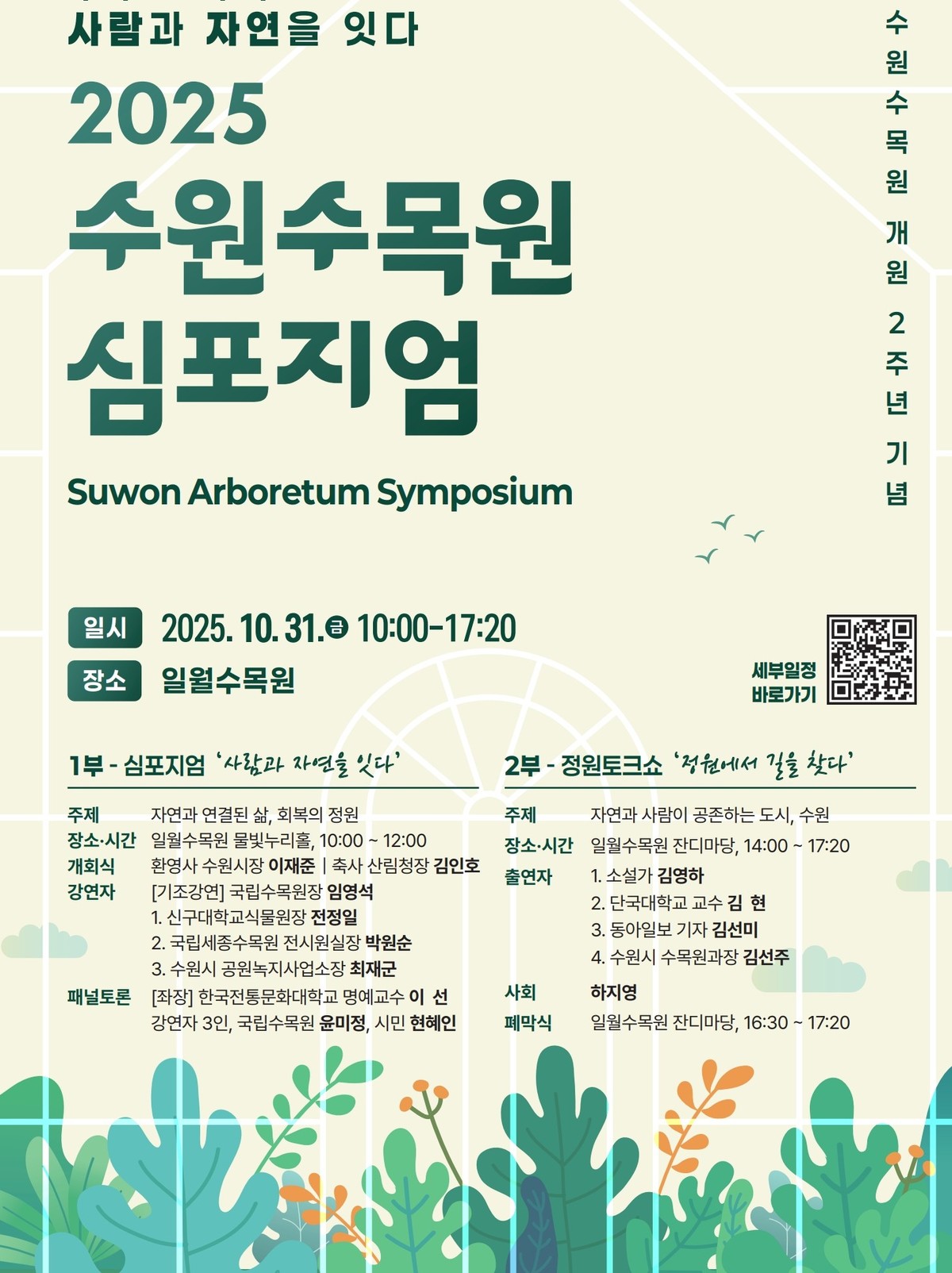 수원수목원은 오는 31일 일월수목원에서 '2025 수원수목원 심포지엄 '사람과 자연을 잇다''를 개최한다고 20일 밝혔다. 이번 행사는 '자연과 연결된 삶, 회복의 정원'을 주제로 정원·생태·도시 분야 전문가와 시민이 참여해 지속가능한 녹색도시 수원의 미래를 논의한다. 1부 심포지엄 '사람과 자연을 잇다'에서 임영석 국립수목원장이 '식물이 이끄는 민주주의, 식물 거버넌스'를 주제로 기조 강연한다. 도시 생물다양성 보전을 위한 모두의 공공정원 등 다양한 주제로 발표가 이어진다.