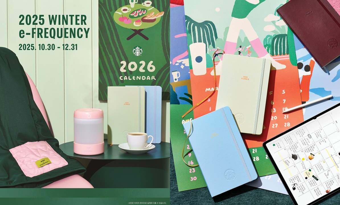이번 겨울 e-프리퀀시 증정품은 겨울 프리퀀시의 상징인 플래너(라이트 그린, 스카이 블루, 버건디)와 스타벅스 2026 캘린더를 포함한다.