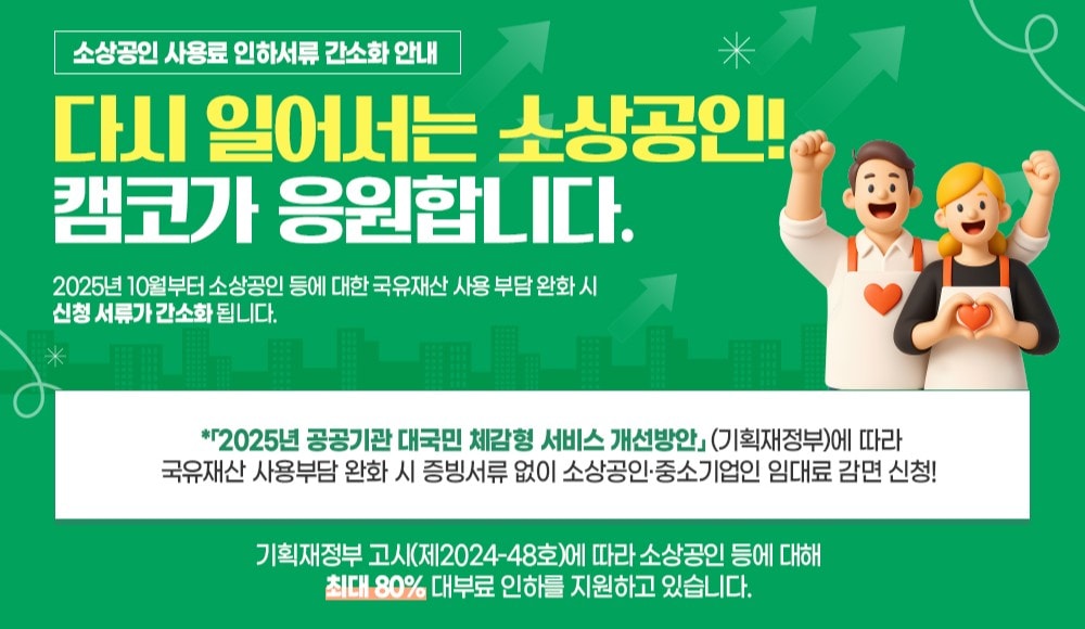 캠코는 중소기업기술정보진흥원 및 소상공인시장진흥공단과 협업을 통해 '소상공인 사용료 인하서류 간소화' 서비스를 도입했다고 20일 밝혔다.
