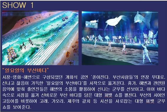 '쇼 1'과 '쇼 2'는 경기장 전체를 대형 발광다이오드(LED) 무대로 꾸며 영상과 공연이 함께 어우러지는 신비로운 무대를 펼칠 예정이다.'쇼 1'에서는 '일요일의 부산바다'를 주제로 군무와 대형 인형극를 선보인다.