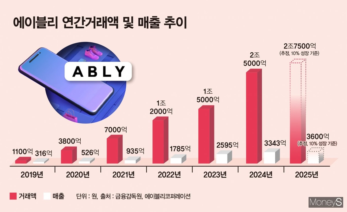 21일 머니S 취재 결과, 에이블리의 성장세는 숫자로 확인된다. 연간 거래액(GMV)은 2019년 1100억원에서 지난해 여성 플랫폼 최초로 2조원을 돌파했다. ▲2020년 3800억원 ▲2021년 7000억원 ▲2022년 1조2000억원 ▲2023년 1조5000억원 ▲2024년 2조5000억원 등이다.