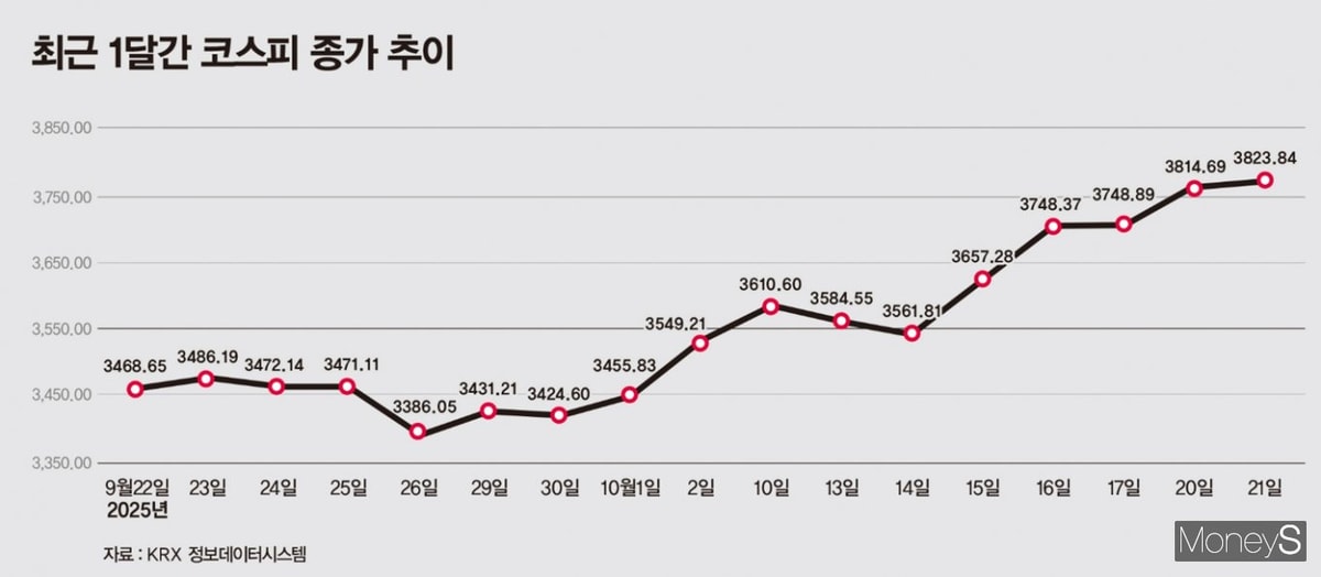 23일 한국거래소에 따르면 9월22일부터 10월21일까지 한 달 동안 코스피는 355.19포인트 올랐다. 9월22일 종가 기준으로 3468.65였던 코스피는 10월21일에는 3823.84로 마감해 10.24%의 상승률을 기록했다. 22일도 코스피는 전 거래일 대비 1.56%(59.84포인트) 오른 3883.68로 마감하며 상승세를 이어갔다.