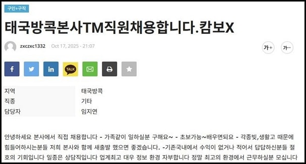 최근 한 구인·구직 사이트에는 "태국방콕본사TM(텔레마케터)직원채용합니다. 캄보X"라는 제목의 글이 올라왔다. 작성자 A씨는 "본사에서 직접 채용한다. 가족같이 일하실 분 구한다"면서 "초보 가능, 배우면 된다. 각종 빚이나 생활고로 힘든 분들, 저희와 함께 새 출발 하자. 국내에서 수익이 없거나 적어서 답답했던 분들에게 절호의 기회"라고 적었다. 또 "상담직이다. 업계 최고 대우를 자부한다. 정말 최고의 환경에서 근무하실 분 모신다"라며 "신변 안전 보장하겠다. 두려움 말고 와서 돈 벌 생각만 해라"라고 유혹했다.