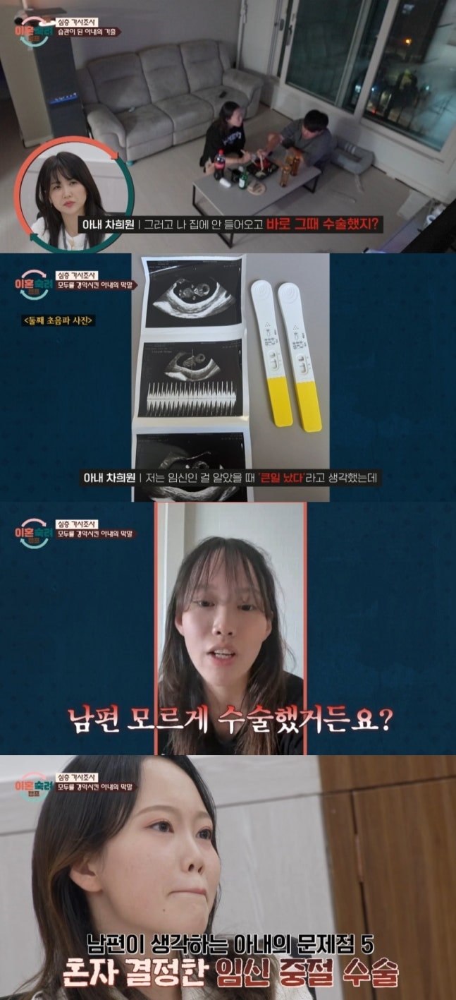 아내는 "5월 초쯤에 임신을 알았다. 임신인 걸 알았을 때 '큰일 났다'고 생각했는데 남편은 엄청나게 좋아했다"고 말했다. 하지만 아내는 남편 몰래 중절 수술을 감행했고 남편은 큰 상처와 충격을 받았다. 이에 서장훈은 "아무리 그래도 수술 전에 아빠의 동의가 없었다. 남편에게도 굉장히 충격적인 일이다. 본인 감정만 생각하고 행동했다. 너무한다는 생각이 든다"고 지적했다.
