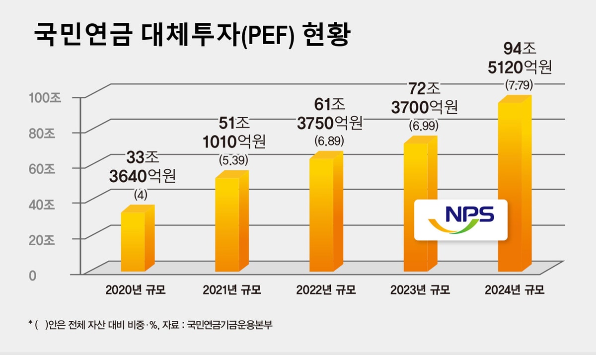 국민연금이 MBK 펀드에 투자한 배경에는 '수익률 중심의 운용 기조'가 있다. 국민연금은 연금 고갈 우려에 대응하고 고수익을 확보하기 위해 최근 몇 년 동안 대체투자 비중을 확대해왔다. 특히 PEF는 일반 공모펀드보다 운용이 자유롭고 목표 수익률이 높아 대체투자 전략에서 핵심 축(올해 기준 45.6%)으로 자리 잡았다. 국민연금기금운용본부에 따르면 국민연금의 PEF 출자 금액은 2020년 약 33조원에서 지난해 말 기준 약 95조원대로 세배 가까이 증가했다.