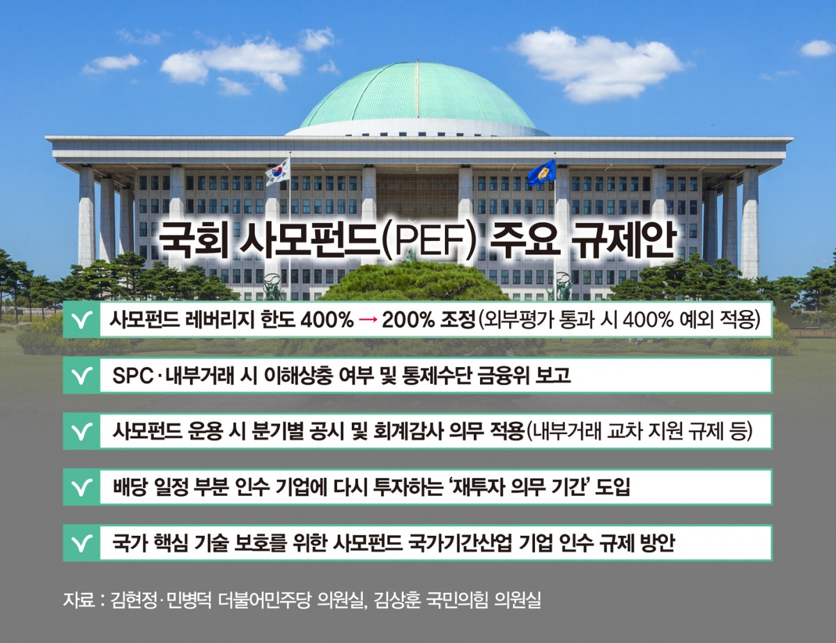 이러한 흐름 속 국회는 사모펀드의 순기능은 보존하되 부작용을 최소화할 수 있는 규제를 마련하고자 적극적인 모습을 보이고 있다. 국회 정무위원회 소속 더불어민주당 김승원 의원은 "PEF의 단기 차익 중심 경영 고착화가 기업과 경제에 미치는 악영향이 심각히 우려된다"며 "PEF의 순기능을 살리되 역기능을 최대한 억제하는 건전한 규제 방향이 필요하다"고 강조했다.