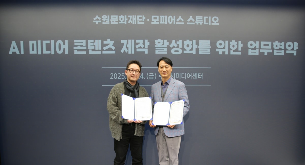 수원문화재단(대표이사 오영균) 미디어센터는 지난 24일 모피어스 스튜디오(대표 이수영)와 'AI 기반 콘텐츠 창·제작 협력 체계 구축'을 위한 업무협약(MOU)을 체결했다고 25일 밝혔다.