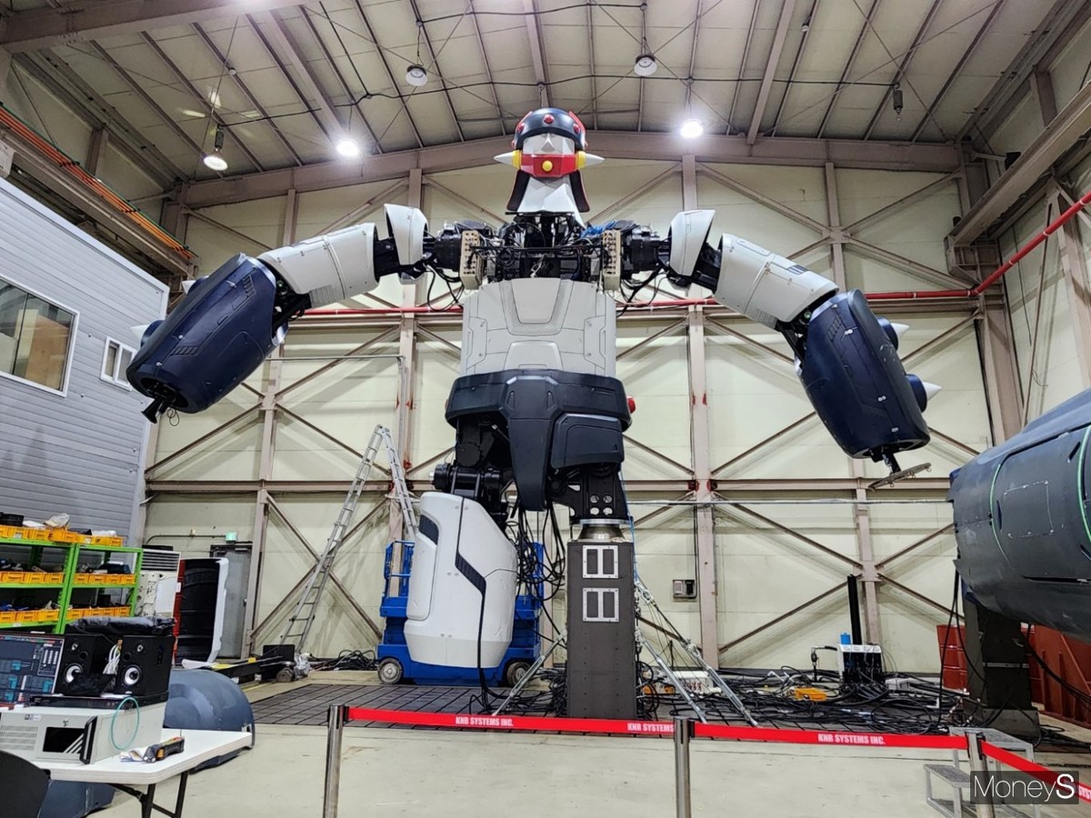 높이 12m에 달하는 거대 로봇이 팔을 휘두르자 이를 바라본 이들의 환호성이 쏟아졌다. 덩치가 커서 움직임이 매우 둔할 것이라 예상했지만 동작은 꽤 빨랐다. 전북 무주군의 의뢰로 경기도 용인 케이엔알시스템(이하 KNR시스템) 공장에서 제작 중인 '로보트 태권V(브이)' 얘기다. 상·하체를 포함한 34개 유압 관절로 제어되며 상체 4.8m·하체 7.2m 규모에 무게는 약 20톤(t)에 달한다. 팔을 뻗고 허리를 틀며 옆차기까지 구현하는 이 로봇은 실제 태권도 품새를 수행할 수 있는 '동작형 로봇'이다. 50여년 전 소년들의 가슴을 웅장하게 만든 만화 속 영웅이 국내 기술로 되살아난 것이다.