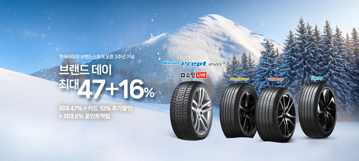 '윈터타이어 얼리버드 특가전'이 진행된다. 라이브를 통해 '윈터 아이셉트 에보3'·'아이온 아이셉트' 등 주요 겨울용 타이어 제품 구매 시 최대 28% 할인과 네이버페이 6% 추가 적립 혜택도 제공된다. 겨울용 타이어 4개 구매 시 기존 타이어를 1년간 무상으로 보관해준다.