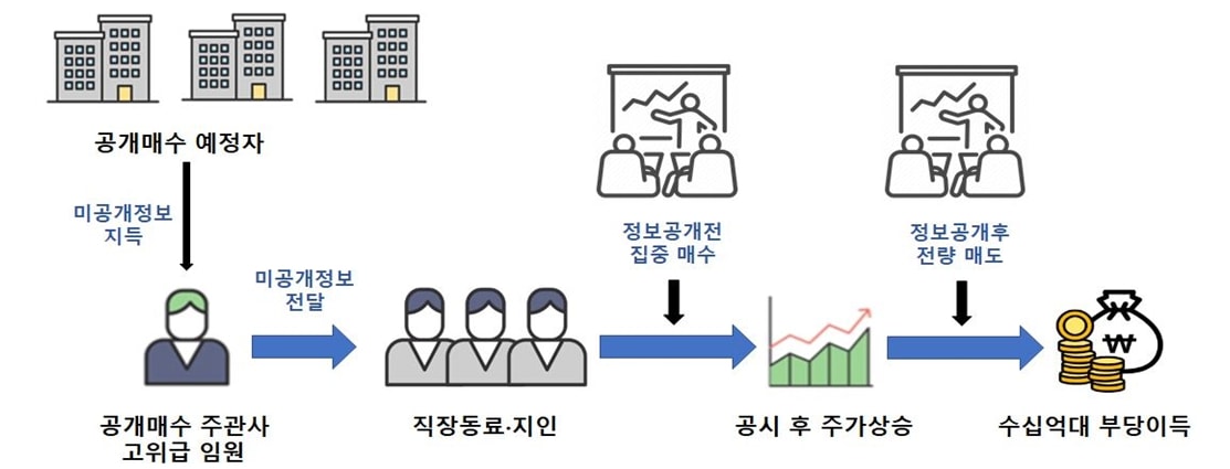 해당 정보를 전달받은 이들은 공개매수 사실이 시장에 공표되기 전 해당 주식을 매수하고 공표 후 주가가 상승하면 전량 매도하는 방식으로 20억원 상당의 부당이익을 편취한 혐의다.