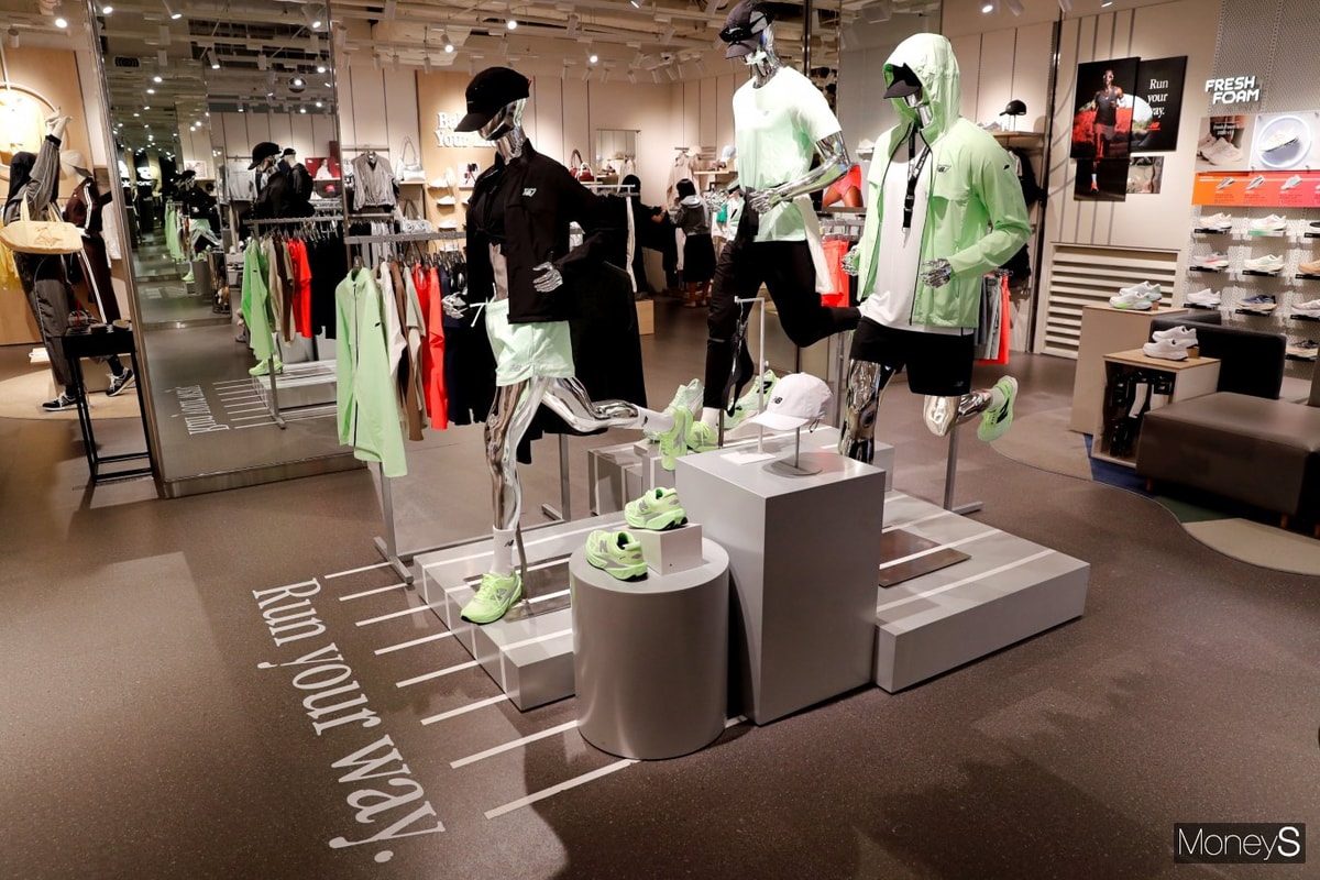 광주신세계 플레이스팟 뉴발란스는 호남 최대 규모 매장으로 일반 매장에서 보기 힘든 SC 엘리트 V, SC 페이서 V2 모델들을 선보인다.