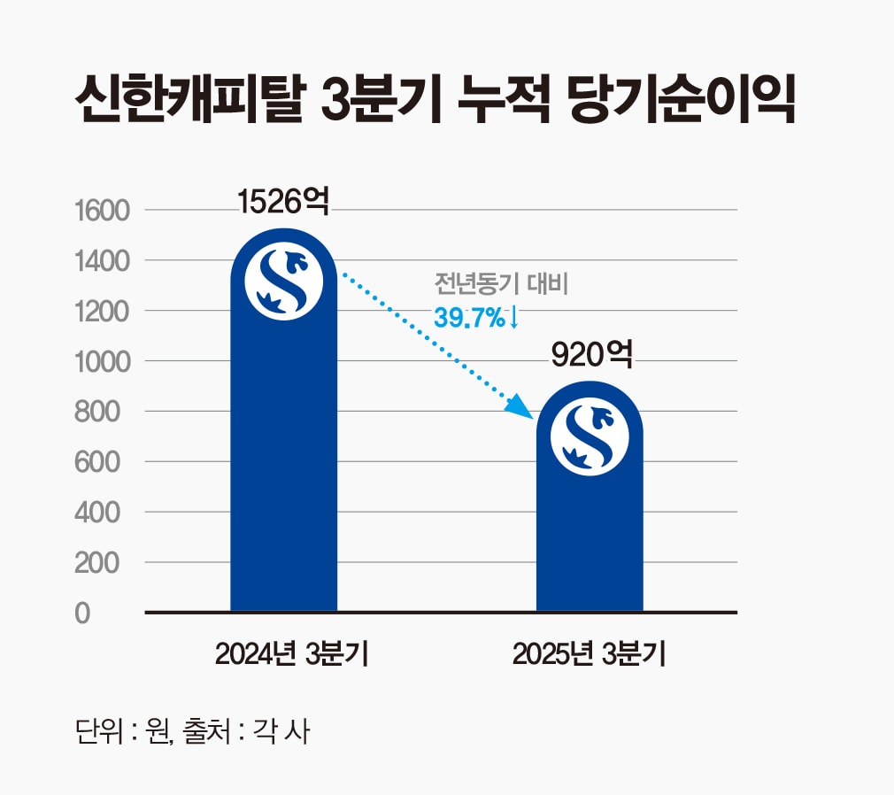 28일 신한금융 실적 공시에 따르면 신한캐피탈의 2025년 3분기 누적 당기순이익은 920억원으로 전년 동기 대비 39.7% 감소했다. 같은 기간 3분기(단기) 당기순이익은 280억원으로 전분기 대비 14.0% 감소했다.