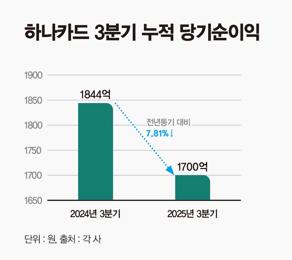 28일 하나금융그룹 실적 공시에 따르면 하나카드의 2025년 3분기 누적 당기순이익은 1700억원으로 전년 동기(1844억원) 대비 7.8% 감소했다. 같은 기간 3분기(단기) 당기순이익은 598억원으로 전분기(557억원) 대비 7.4% 증가했다.