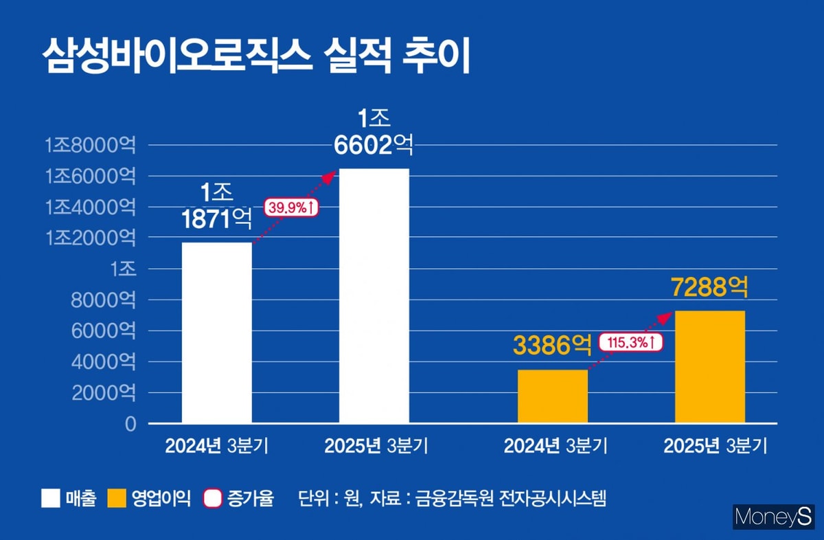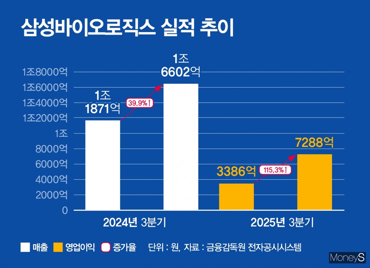 삼성바이오로직스는 올 3분기 매출 1조6602억원, 영업이익 7288억원을 기록했다고 28일 공시했다. 전년 동기 대비 매출은 39.9%, 영업이익은 115.3% 늘며 매출과 영업이익 모두 분기 기준 역대 최대 성과를 냈다. 삼성바이오로직스는 지난해 3분기 매출 1조1871억원, 영업이익 3386억원을 거뒀다.
