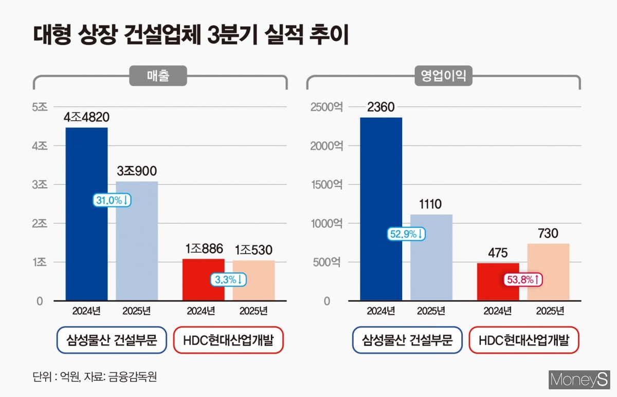 28일 금융감독원 전자공시시스템에 따르면 시공능력 1위 삼성물산은 3분기 영업이익이 9940억원(이하 잠정 기준)을 기록해 전년 동기 대비 34.9% 증가했지만 건설부문은 같은 기간 52.9% 감소해 1110억원을 기록했다. 매출은 전 사업부문 10조1510억원, 건설부문 3조900억원으로 같은 기간 각각 1.5%, 31.0% 감소했다.