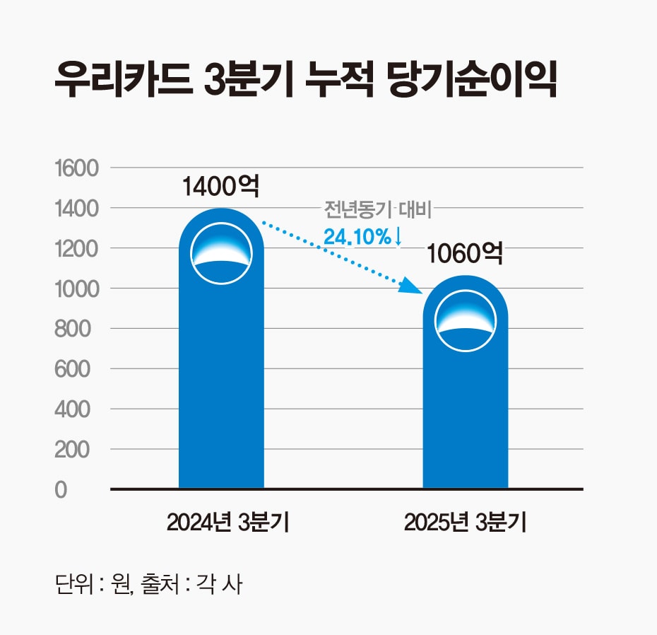 29일 우리금융 실적 공시에 따르면 우리카드의 올해 3분기 누적 당기순이익은 1060억원으로 전년 동기(1400억원) 대비 24.1% 감소했다. 3분기(단일 분기) 기준 당기순이익은 300억원으로, 전분기(430억원)보다 30.2% 줄어들었다.