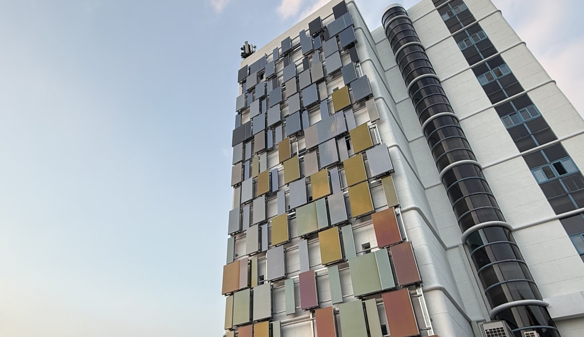 건물 외벽 전면에는 25kw 규모의 컬러 태양광 패널 152개를 총면적 240㎡ 규모로 설치해 ESG를 실천했다. 전력 생산과 예술적 조형미를 결합한 설비다. 낮에는 태양광을 흡수해 에너지를 생산하고 밤에는 외벽 조명을 통해 은은한 빛의 연출을 선보이는 공공예술 작품이다. 옥상에도 30kw 규모 태양광 설비를 운영하며, 생산한 전력은 내부 공용 전력으로 활용한다.