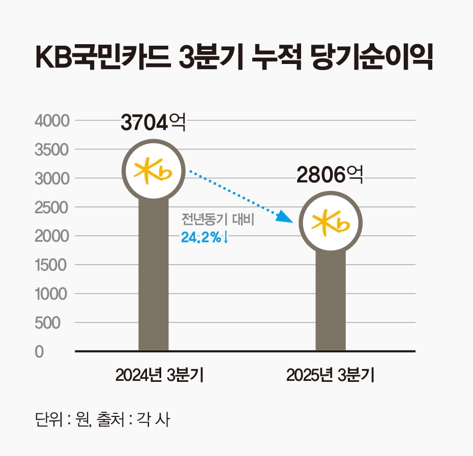 30일 KB금융 실적 공시에 따르면 KB국민카드의 올해 3분기까지 누적 당기순이익은 2806억원으로 전년 동기(3704억원) 대비 24.2% 감소했다. 회사 측은 "가맹점수수료 인하로 인한 수수료이익 감소와 건전성 관리 강화에 따른 대손비용 증가가 영향을 미쳤다"고 설명했다.