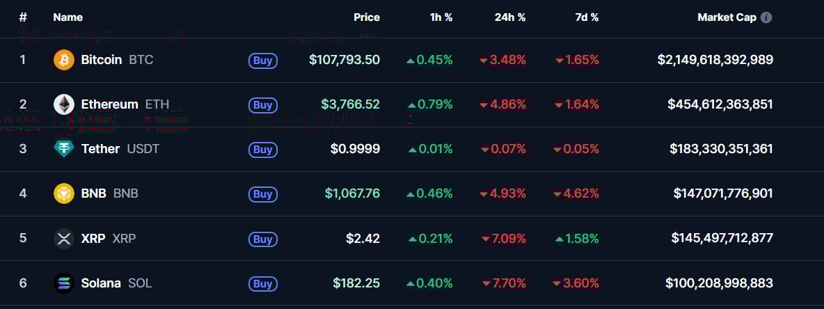 31일 글로벌 코인 시황 중계사이트인 코인마켓캡에 따르면 이날 오전 6시40분 기준 비트코인은 24시간 전보다 3.70% 하락한 10만7522달러(약 1억5397만원)를 기록했다. 시총 2위 이더리움도 5.17% 급락한 3748달러(약 537만원)에 거래되고 있다.