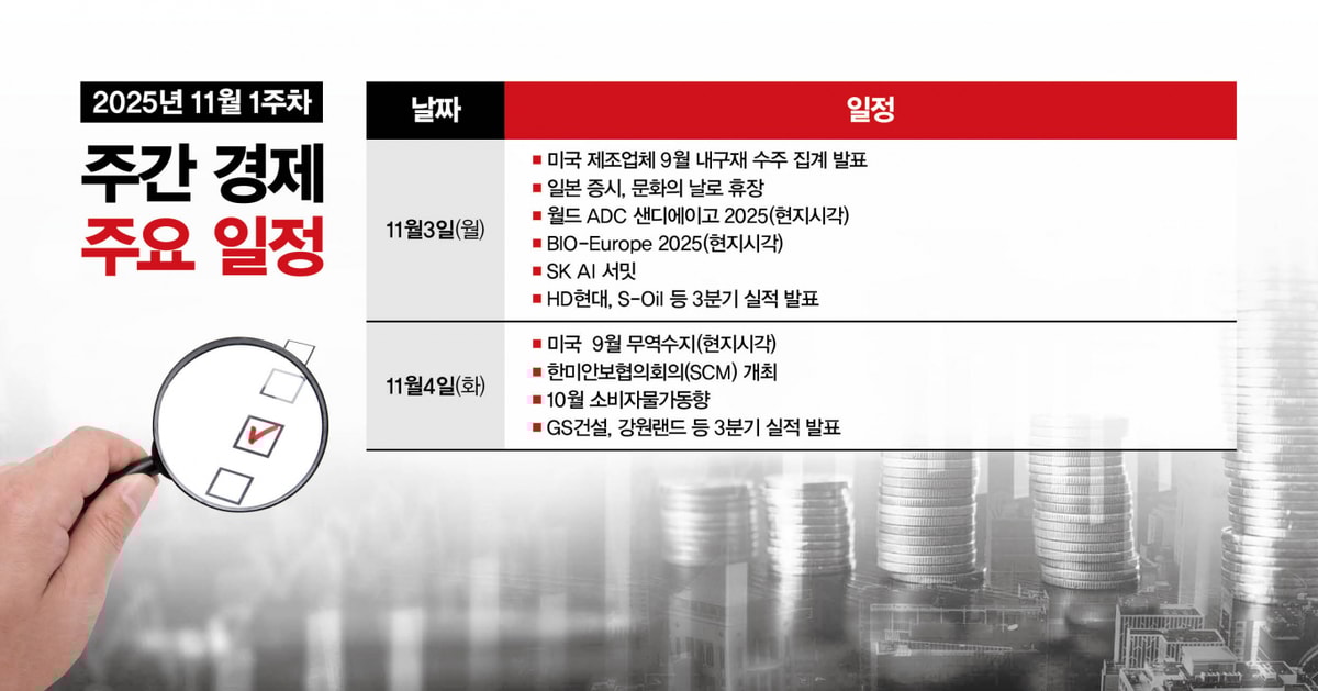 11월 첫째 주에는 미국 제조업 지표와 한미안보협의회의(SCM) 개최가 예정돼 있어 경제와 안보 분야에 이목이 쏠린다. 게다가 국내외 바이오·제약 업계에서 주요 비즈니스 파트너링 행사가 잇따라 열리는 가운데, HD현대와 GS건설 등 국내 주요 기업들의 3분기 실적 또한 시장이 눈여겨봐야 할 포인트다.