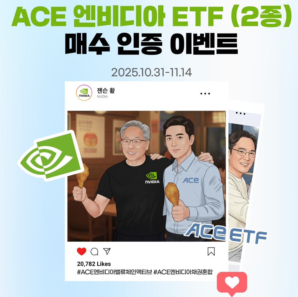 치킨 선물 대상 ETF 2종은 ▲ACE 엔비디아밸류체인액티브 ETF ▲ACE 엔비디아채권혼합 ETF다.