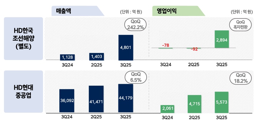 HD한국조선해양이 고선가 수주 물량의 인도가 본격화되면서 계절적 비수기에도 3분기 첫 영업이익 1조원을 돌파했다. 회사는 수익성 회복을 바탕으로 미국 '마스가'(MASGA, 미국 조선업 재건) 연계 프로젝트와 차세대 원자력·해상풍력 등 해외 사업을 확대한다는 계획이다.
